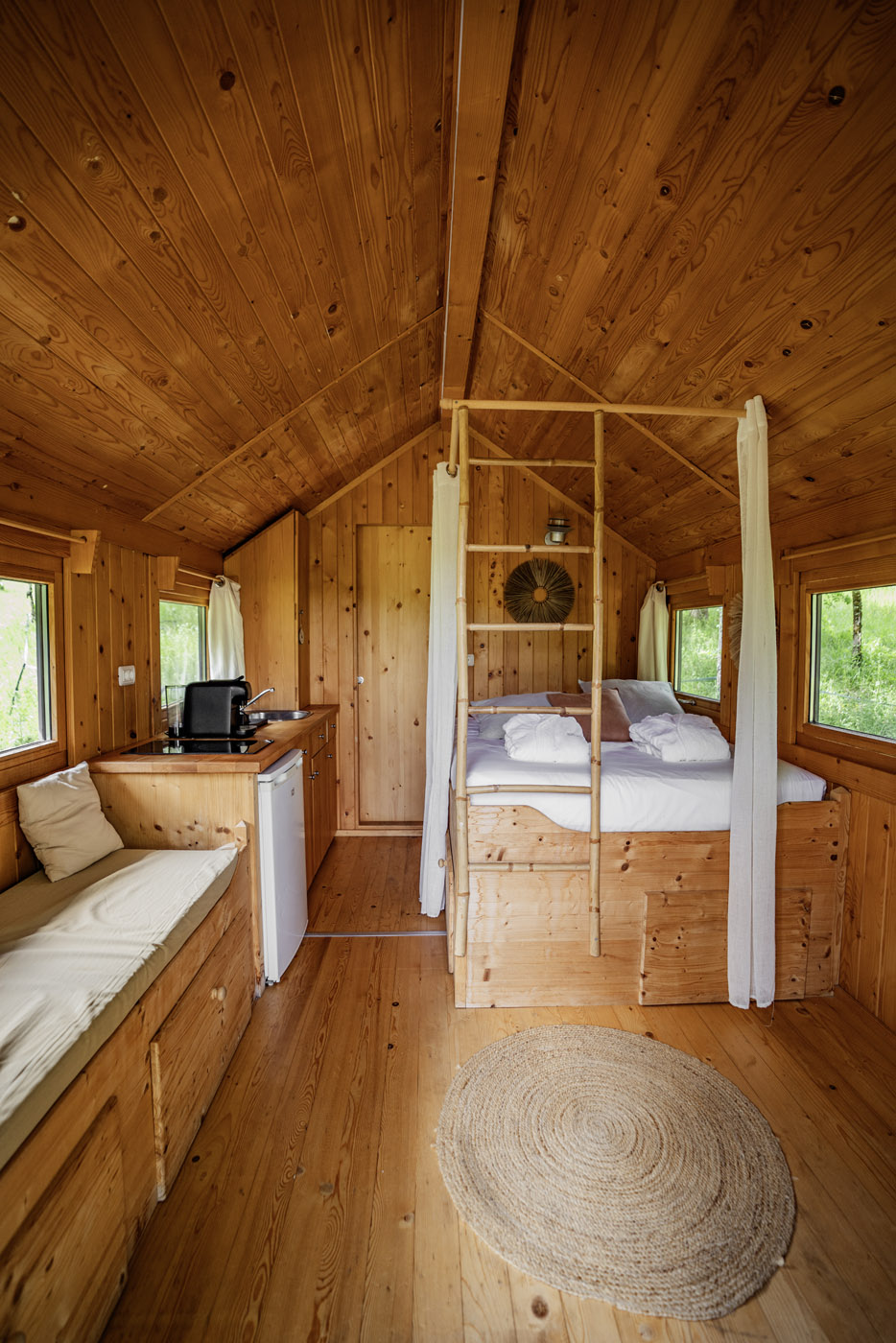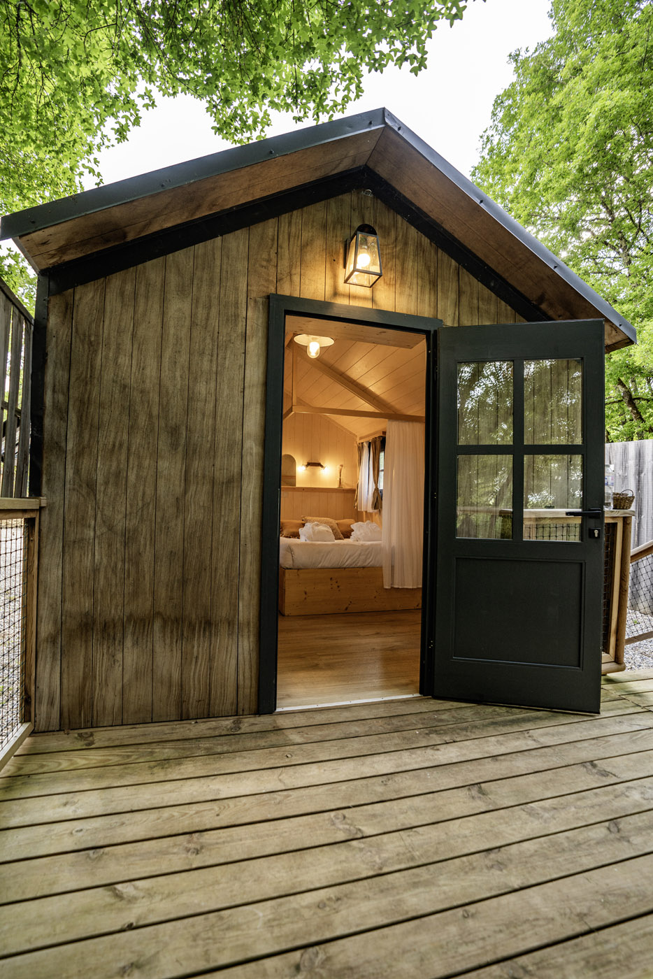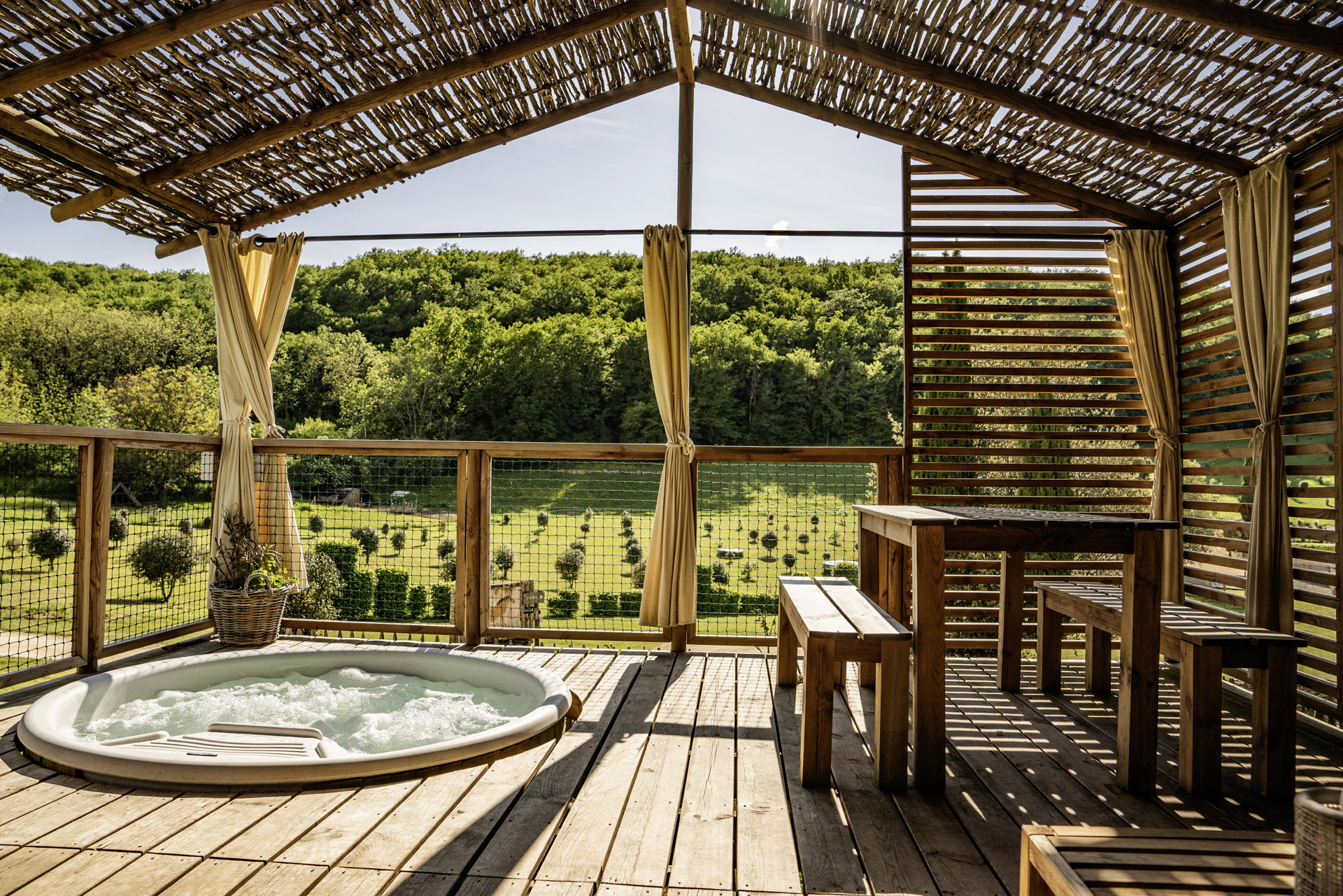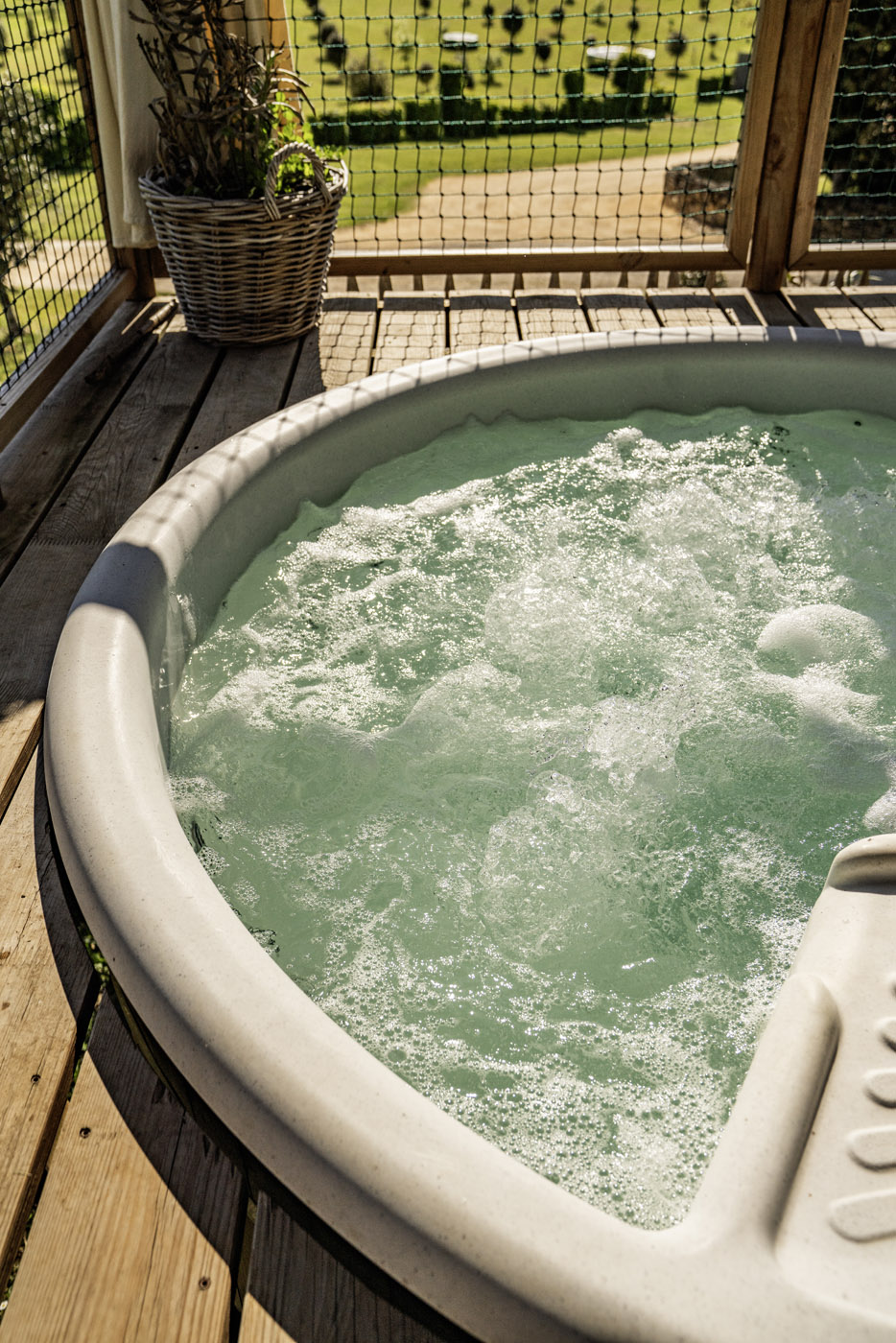 La Sola est notre toute nouvelle cabane avec spa privatif construite en 2024. Avec son immense terrasse et son spa XXL, cette cabane avec spa privatif faite pour un maximum de deux adultes et un enfant, est parfaite pour profiter de l’extérieur avec tout le confort. Elle bénéficie d’une vue magnifique sur le domaine tout en préservant votre intimité grâce à un système ingénieux de liteaux disposé en oblique sur la terrasse.