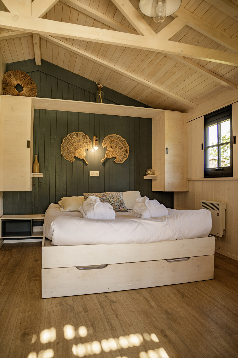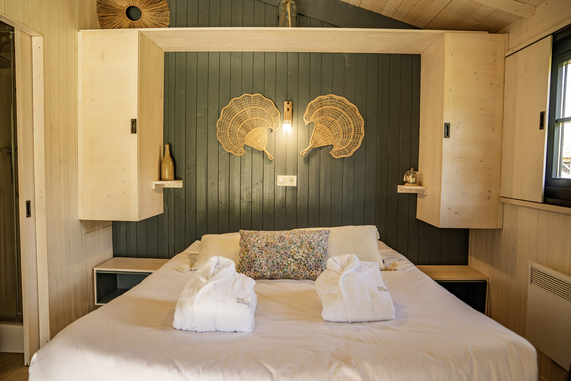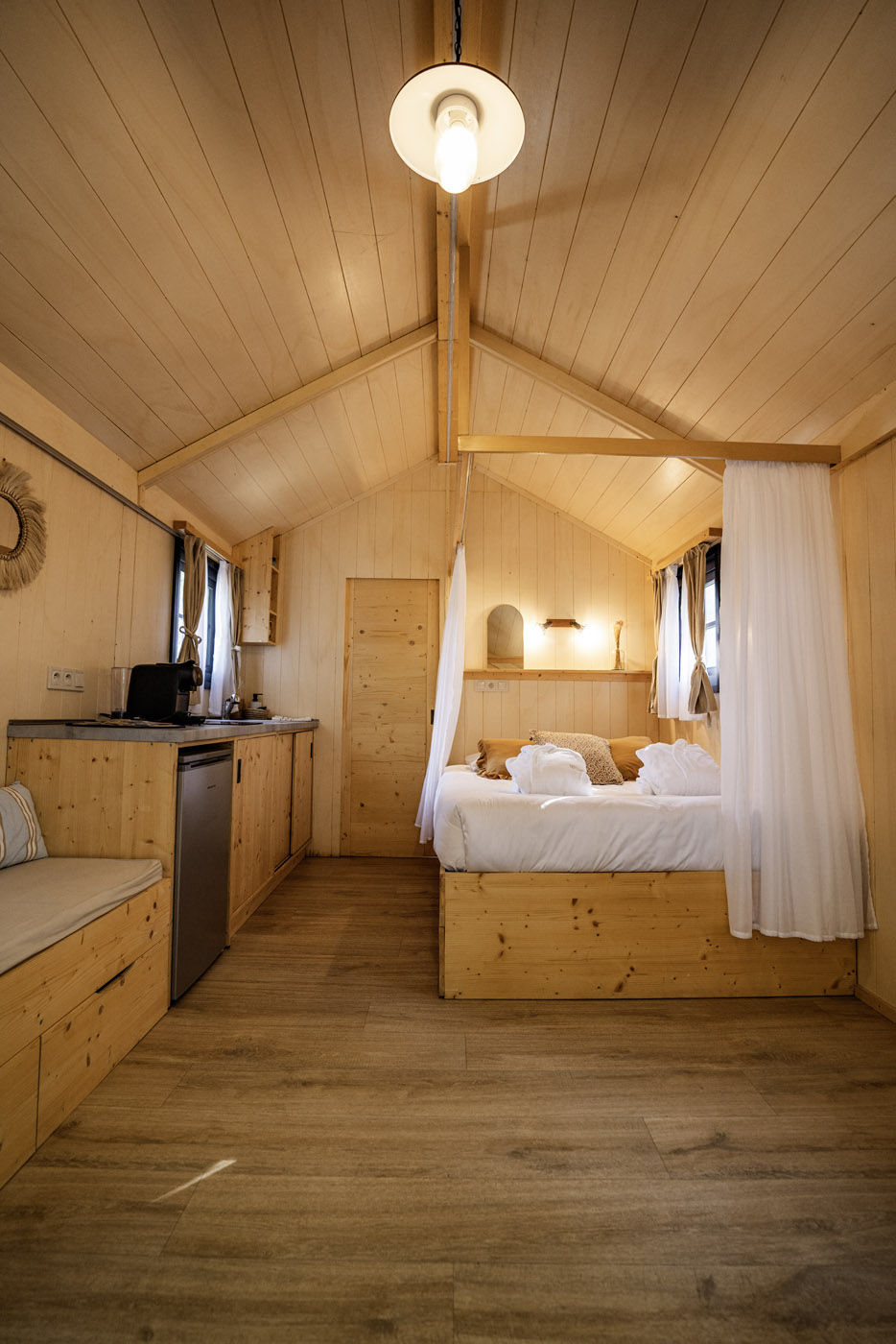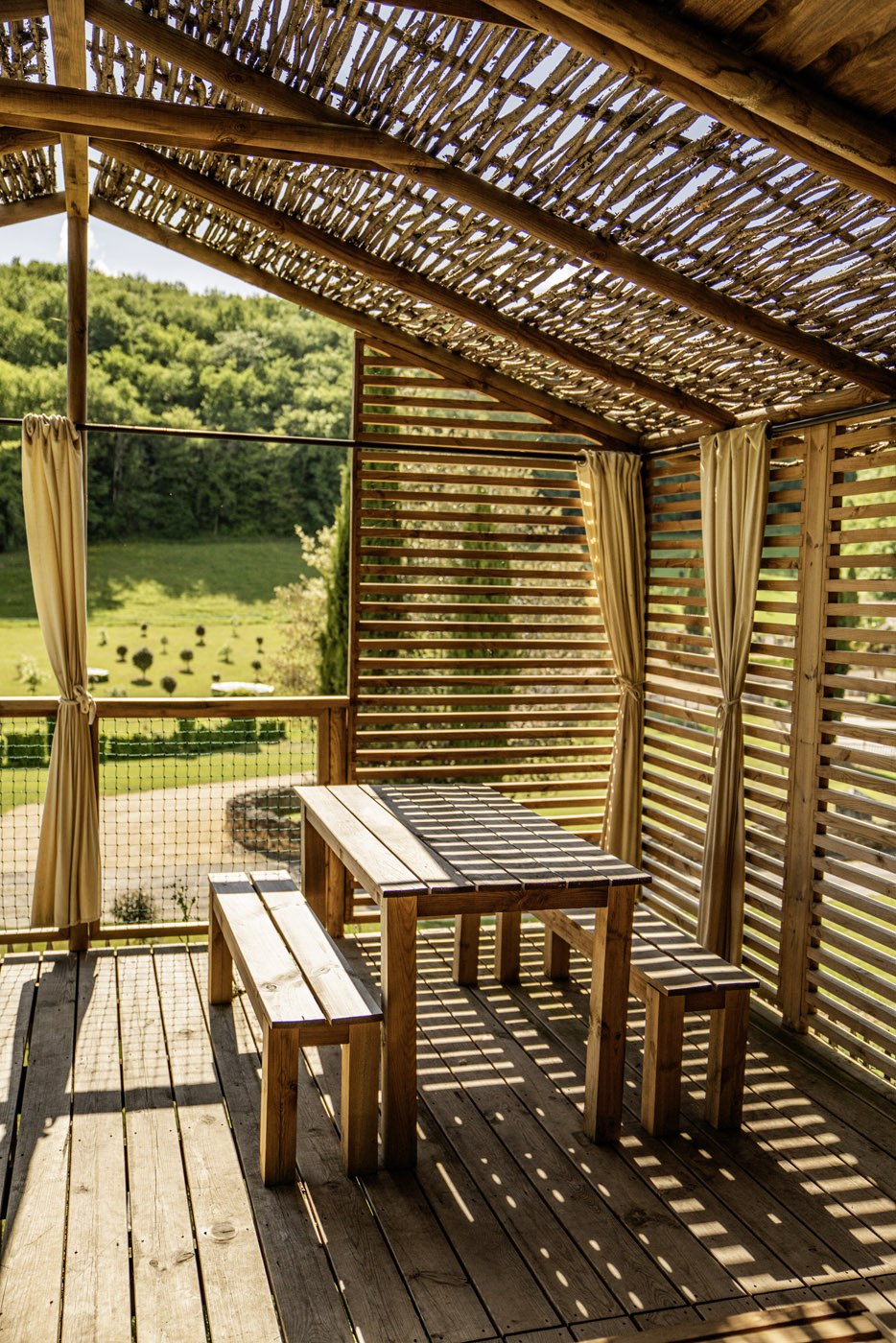 La Sola est notre toute nouvelle cabane avec spa privatif construite en 2024. Avec son immense terrasse et son spa XXL, cette cabane avec spa privatif faite pour un maximum de deux adultes et un enfant, est parfaite pour profiter de l’extérieur avec tout le confort. Elle bénéficie d’une vue magnifique sur le domaine tout en préservant votre intimité grâce à un système ingénieux de liteaux disposé en oblique sur la terrasse.